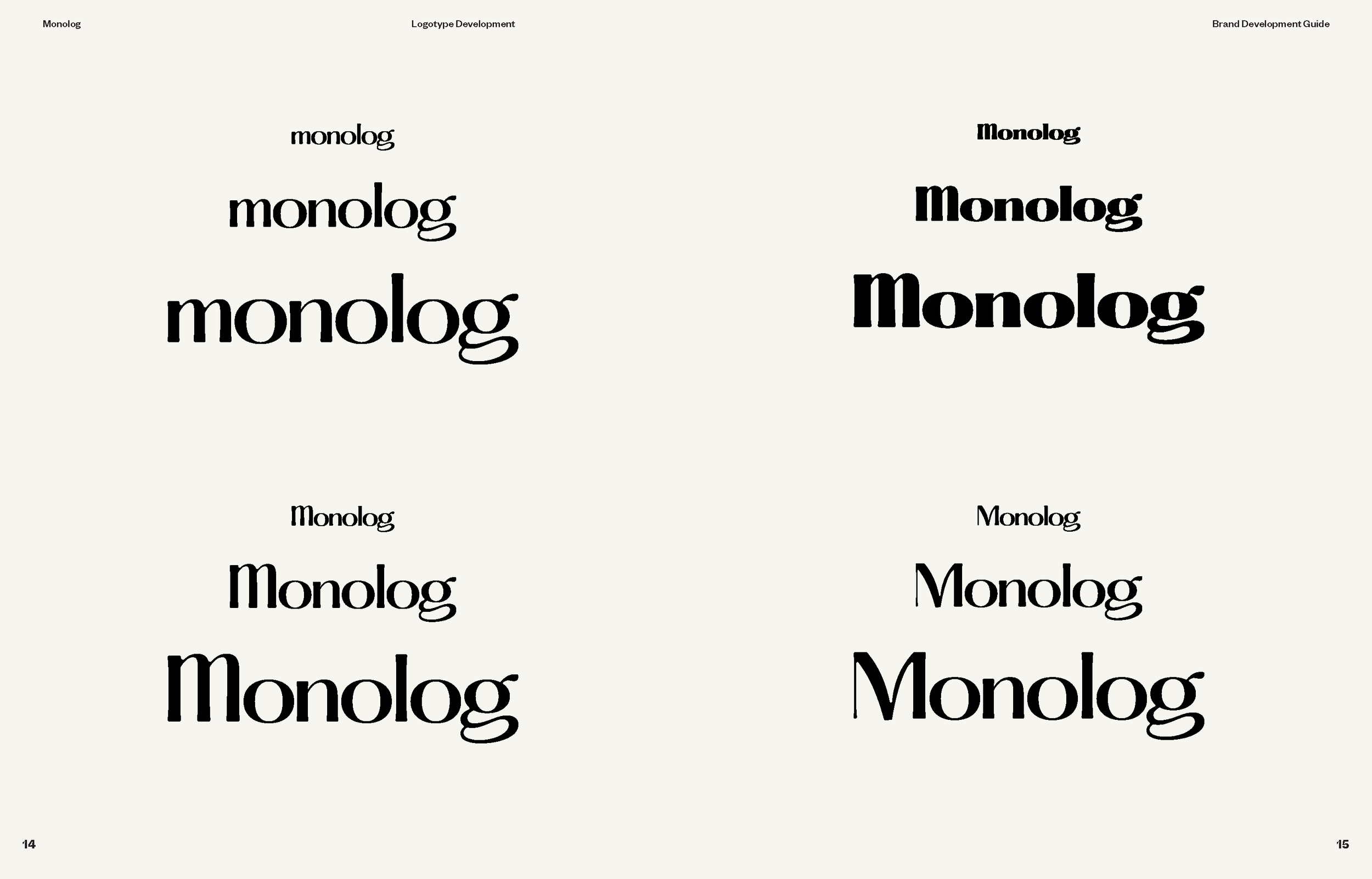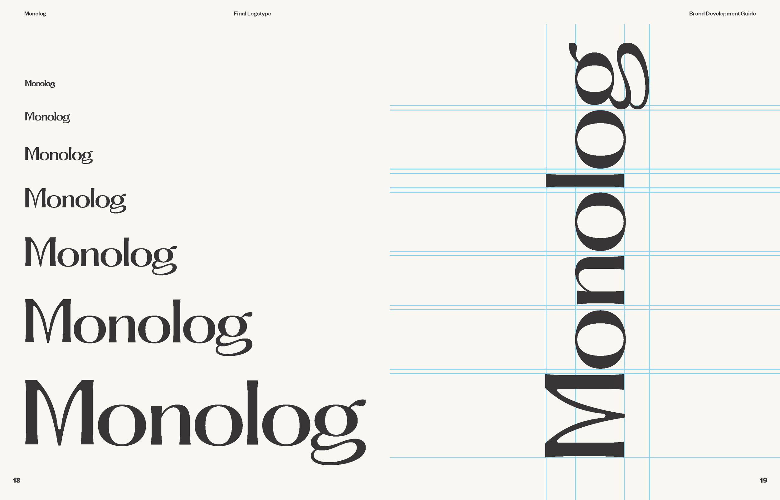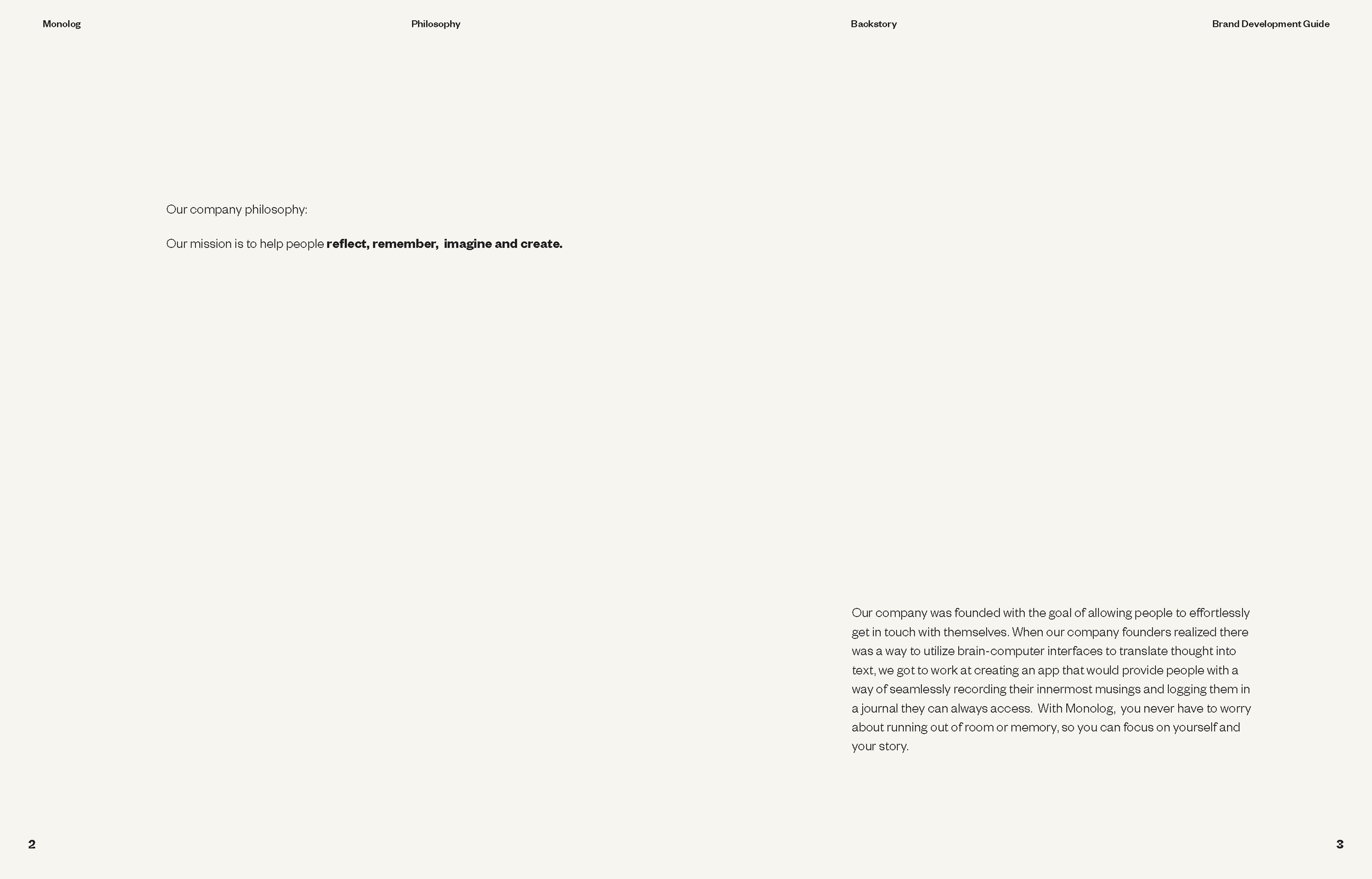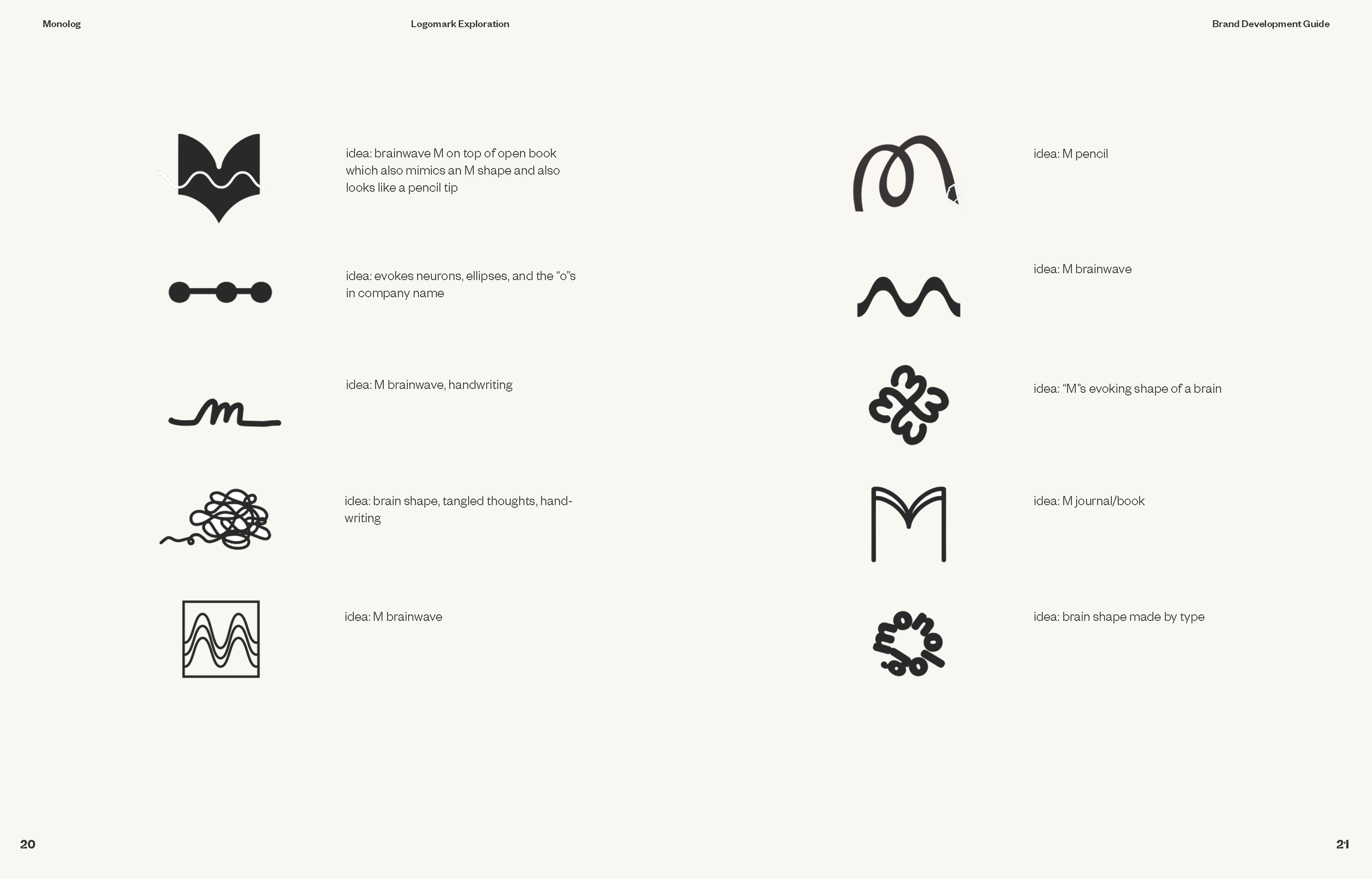 Full brand development guide for Monolog, a speculative app that translates thoughts into text. Includes logomark exploration, type skeletons, color palettes, applications, etc.