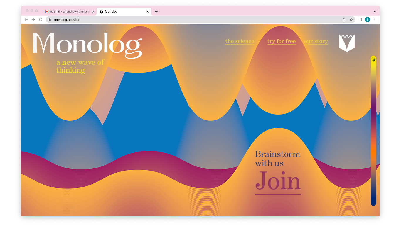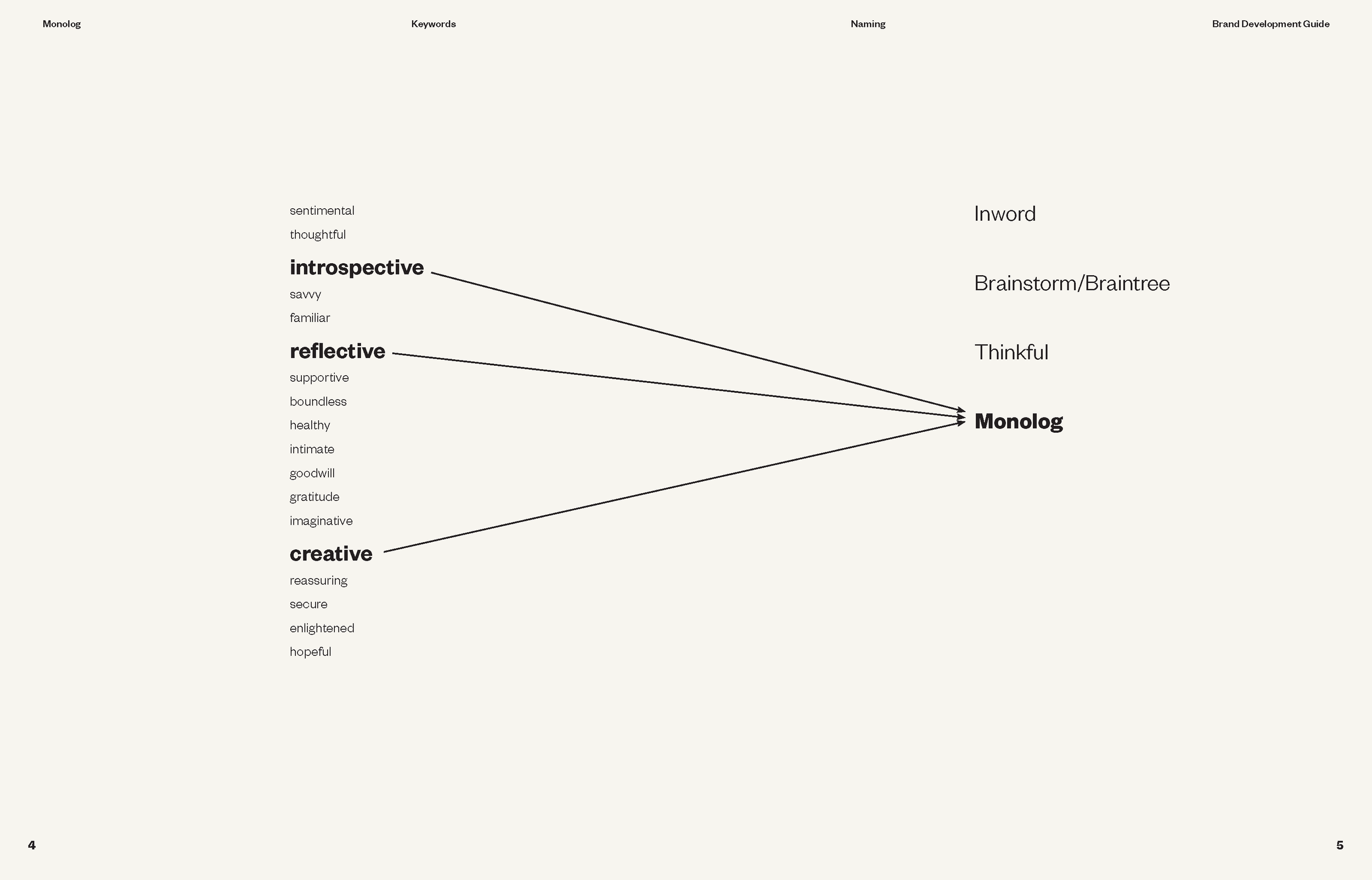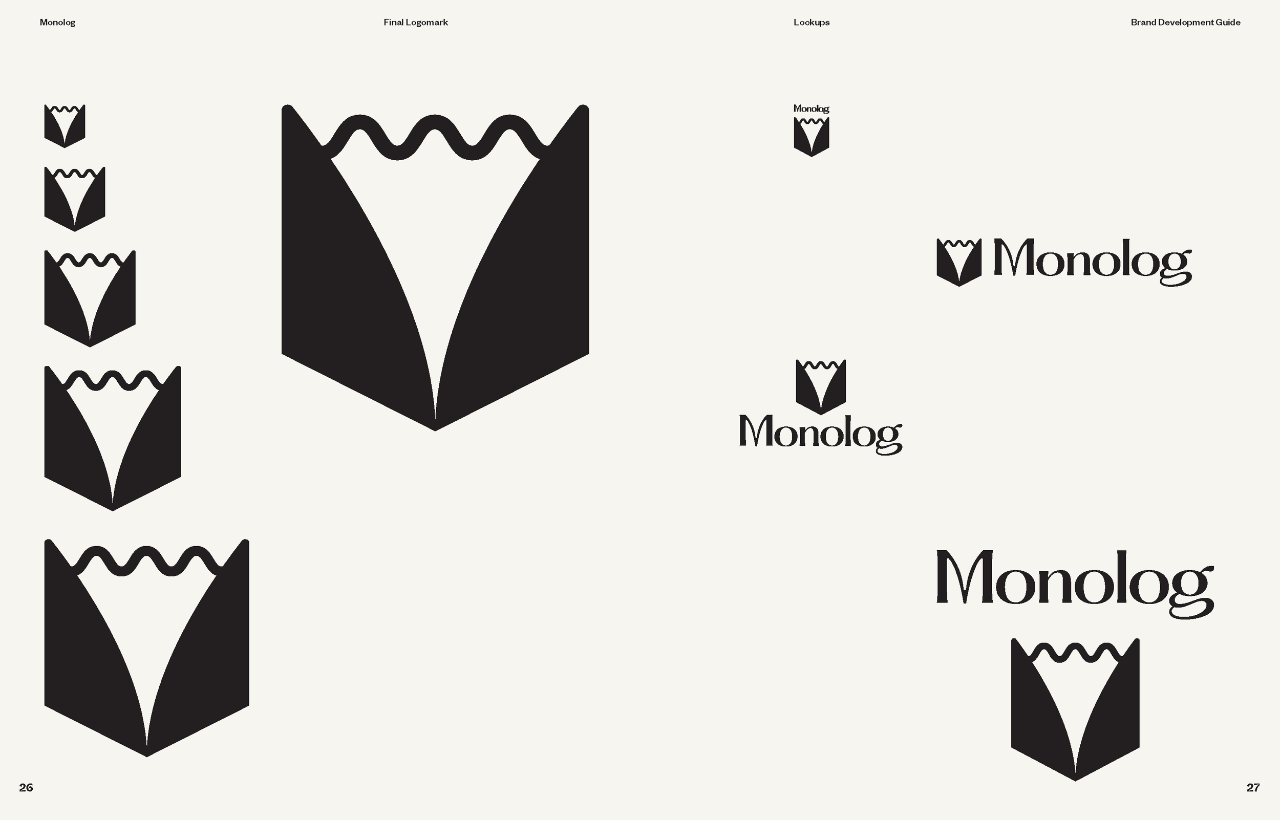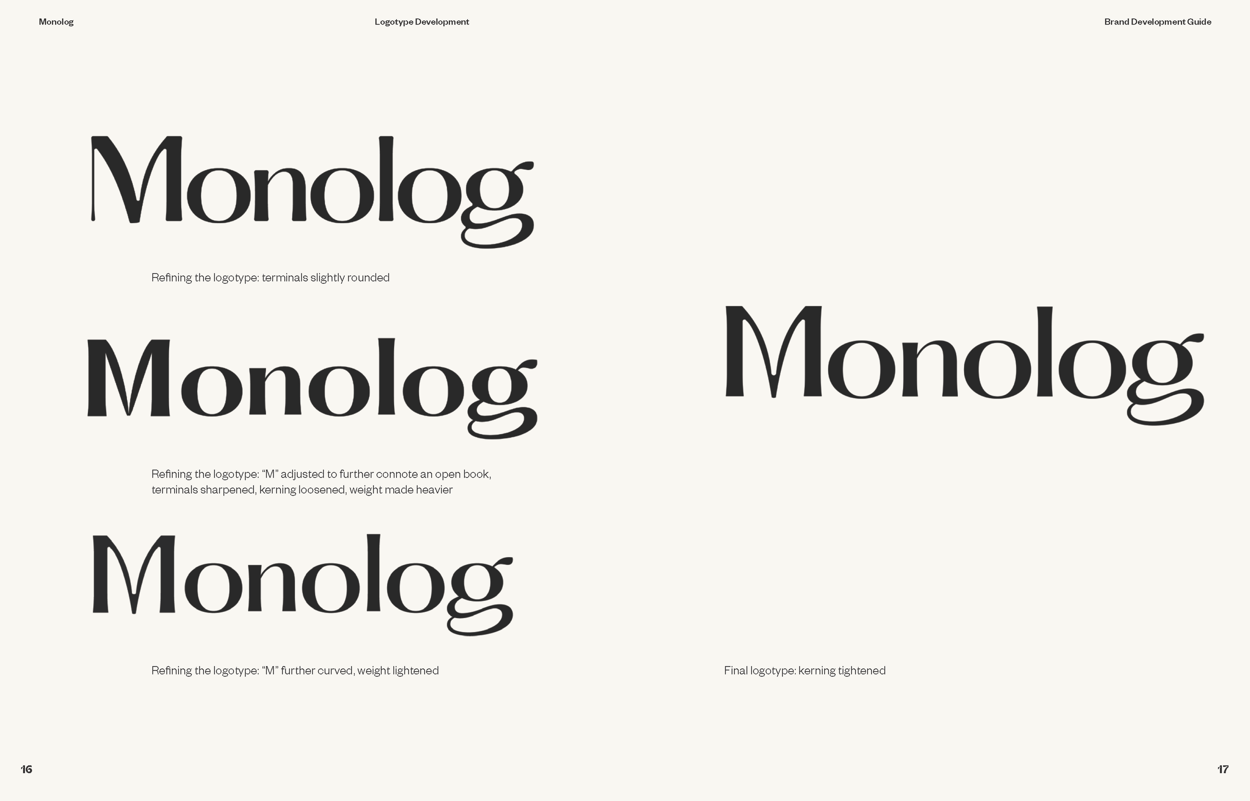 Full brand development guide for Monolog, a speculative app that translates thoughts into text. Includes logomark exploration, type skeletons, color palettes, applications, etc.